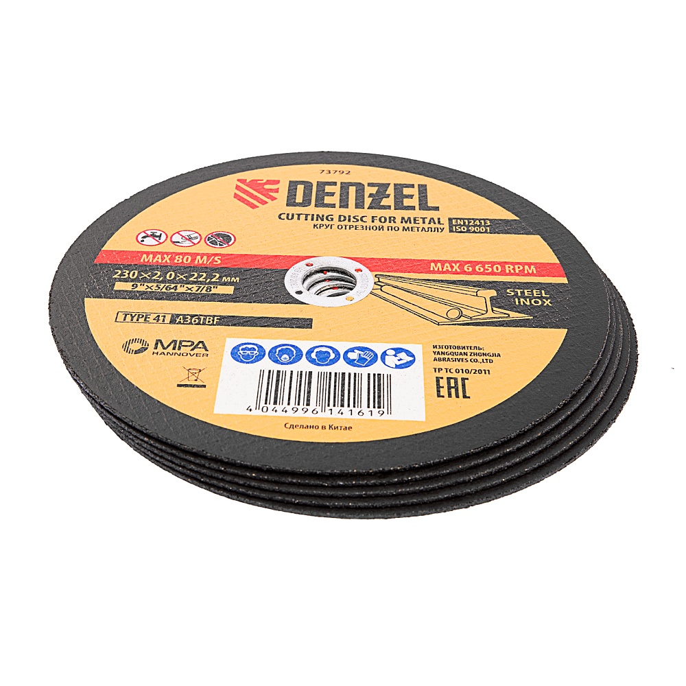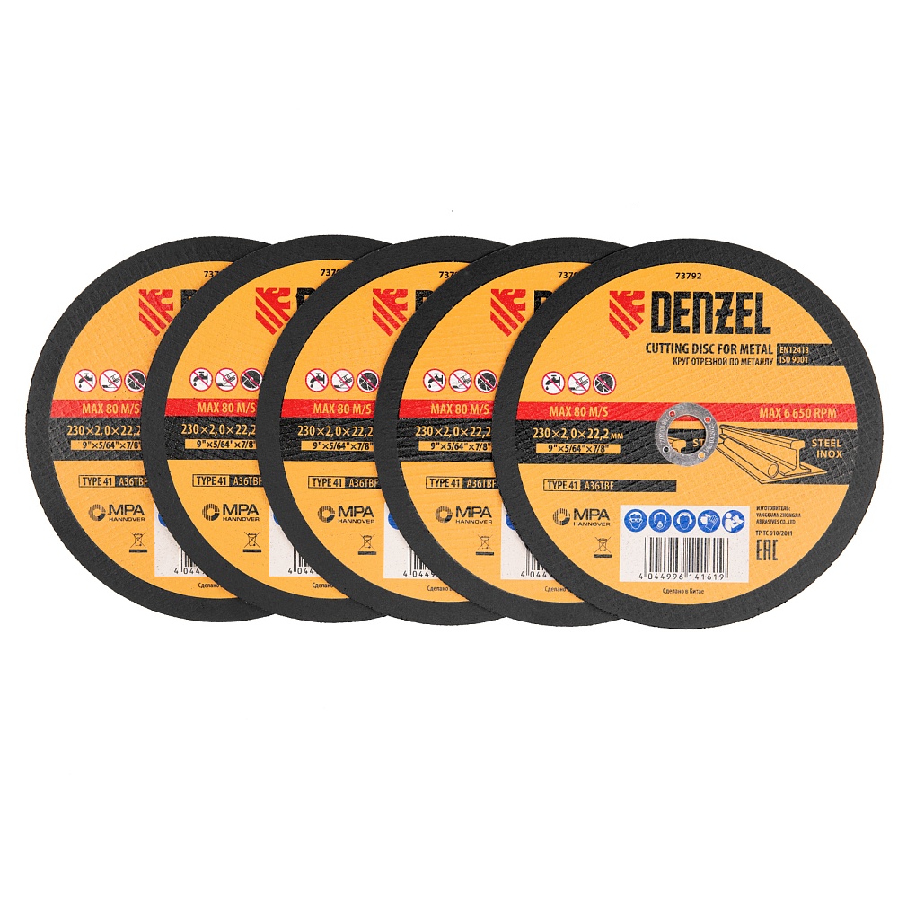 <p>Отрезной круг по металлу Denzel A36TBF 73792 размером 230 х 2,0 х 22,2 мм рассчитан на интенсивную работу с УШМ. Подходит для резки углеродистой и нержавеющей легированной стали. Круг можно использовать не только в быту, но и для решения профессиональных задач.</p><h2>Преимущества</h2><ul><li>Эффективность — абразив из белого электрокорунда со специальными добавками быстро режет материал, в т.ч. нержавеющие стали, и не перегревается, в отличие от оксида алюминия.</li><li>Высокий ресурс — благодаря толщине 2 мм и средней по плотности структуре круг стабильно режет сталь даже при больших объемах работ.</li><li>Надежность — оптимально подобранная теплостойкая бакелитовая связка с упрочняющими элементами крепко удерживает абразив.</li><li>Безопасная работа — усиленная стеклосетка увеличивает прочность круга на разрыв, предотвращая его разрушение при высоких нагрузках.</li><li>Высокое качество — круг прошел строгий технологический контроль на каждом этапе производства.</li></ul>