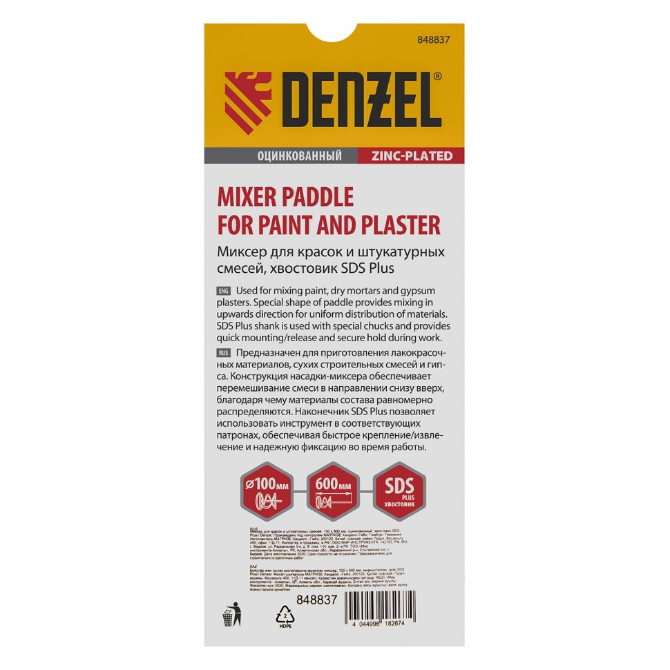 <p>Оцинкованный миксер для красок и штукатурных смесей Denzel 848837 размером 100 х 600 мм, с хвостовиком SDS Plus, используется для замешивания строительных растворов. Спиралевидная рабочая часть перемешивает состав снизу вверх, поэтому все компоненты распределяются в нем равномерно. Защитное кольцо предотвращает повреждение емкости для размешивания состава. Штукатурный миксер устанавливается в патрон перфоратора SDS Plus и применяется во время строительных и отделочных работ.</p><h2>Преимущества</h2><ul><li>Прочность — сварная конструкция стального миксера устойчива к динамическим нагрузкам и выдерживает интенсивное применение.</li><li>Защита от коррозии и механических повреждений — насадка-миксер оцинкована.</li><li>Простая установка — хвостовик быстро и надежно фиксируется в патроне перфоратора.</li></ul>