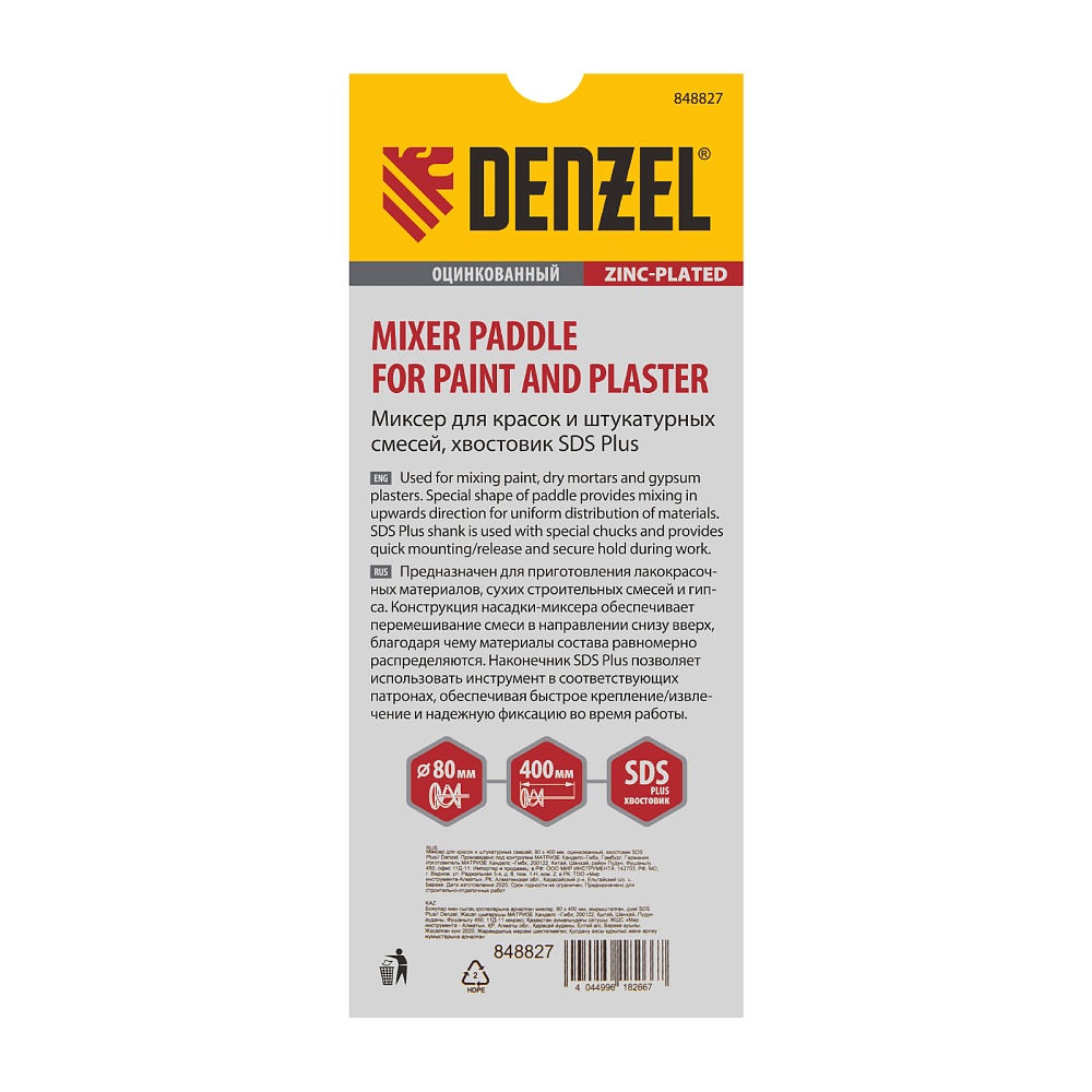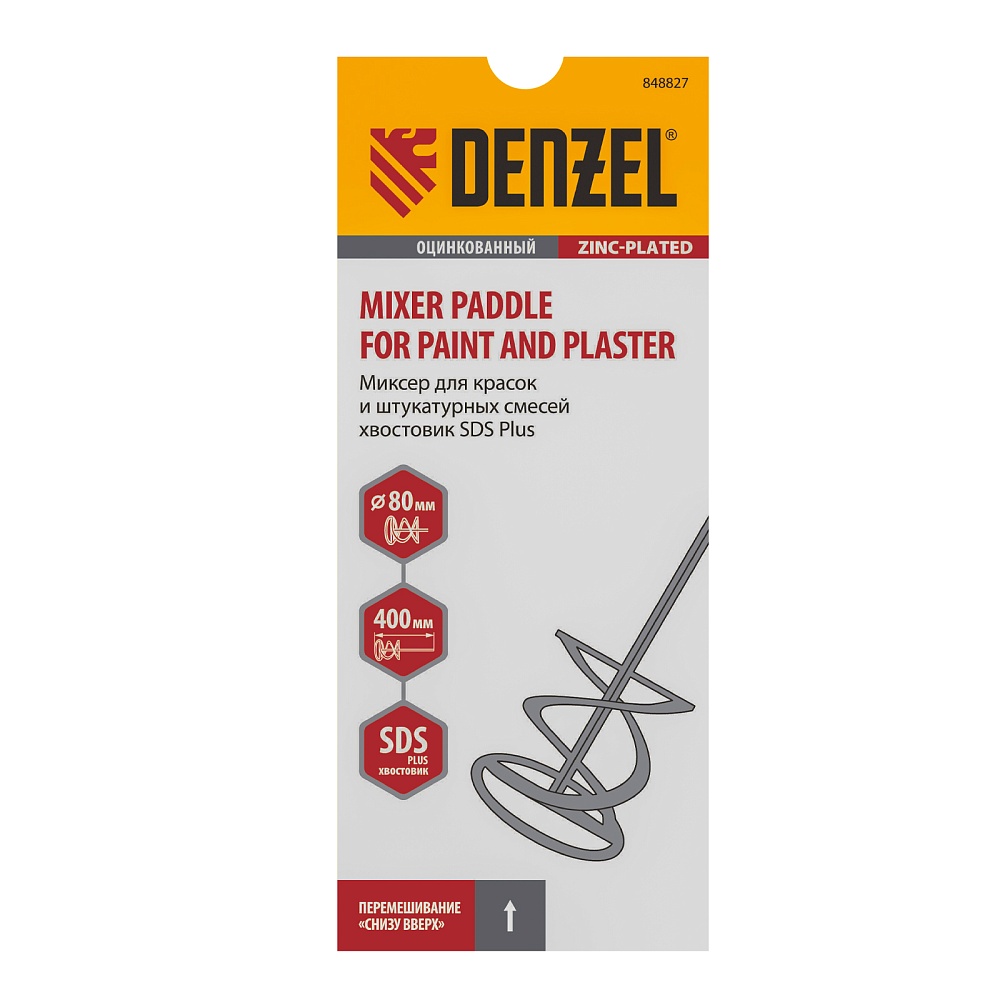 <p>Оцинкованный миксер для красок и штукатурных смесей Denzel 848827 размером 80 х 400 мм, с хвостовиком SDS Plus, используется для замешивания строительных растворов. Спиралевидная рабочая часть перемешивает состав снизу вверх, поэтому все компоненты распределяются в нем равномерно. Защитное кольцо предотвращает повреждение емкости для размешивания состава. Штукатурный миксер устанавливается в патрон перфоратора SDS Plus и применяется во время проведения строительных и отделочных работ.</p><h2>Преимущества</h2><ul><li>Прочность — сварная конструкция стального миксера устойчива к динамическим нагрузкам и выдерживает интенсивное применение.</li><li>Защита от коррозии и механических повреждений — насадка-миксер оцинкована.</li><li>Простая установка — хвостовик быстро и надежно фиксируется в патроне перфоратора.</li></ul>