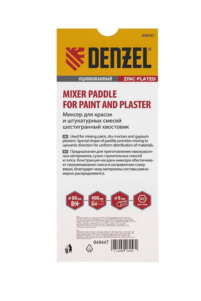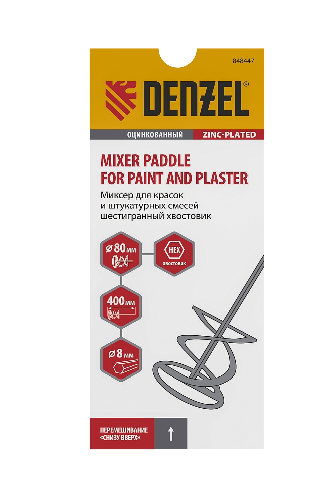 <p>Оцинкованный миксер для красок и штукатурных смесей Denzel 848447 длиной 400 мм, с шестигранным хвостовиком 8 мм, имеет венчик диаметром 80 мм и используется для приготовления строительных растворов. Насадка перемешивает состав снизу вверх, что позволяет добиться полной однородности готовой смеси. Защитное кольцо предотвращает повреждение емкости, в которой готовится раствор. Миксер пригодится во время строительства и ремонта.</p><h2>Преимущества</h2><ul><li>Деформационная стойкость — прочная сварная конструкция выдерживает активное использование.</li><li>Долговечность — оцинкованная поверхность миксера устойчива к механическим повреждениям и образованию коррозии.</li><li>Надежная фиксация в зажимном патроне — насадка подходит для установки на дрели и миксеры средней и высокой мощности.</li></ul>
