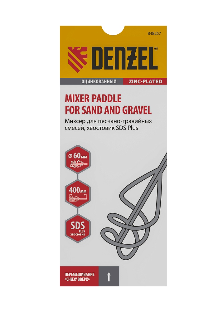 <p>Оцинкованный миксер Denzel 848257 диаметром 60 мм и длиной 400 мм, с хвостовиком SDS-plus, используется во время строительства и ремонта для перемешивания песчано-гравийных и других тяжелых смесей. Вращающаяся спираль движется по часовой стрелке, поднимая тяжелые частицы вверх и придавая однородность размешиваемому составу. Миксер SDS-plus совместим с перфораторами средней и высокой мощности.</p><h2>Преимущества</h2><ul><li>Простая установка — хвостовик миксера быстро и надежно фиксируется в патроне, эффективно передавая крутящий момент.</li><li>Прочность и долговечность — миксер выполнен из стали и оцинкован для защиты от коррозии и механических воздействий.</li><li>Эффективная работа с густыми смесями — благодаря прочной сварной конструкции насадка не деформируется.</li></ul>