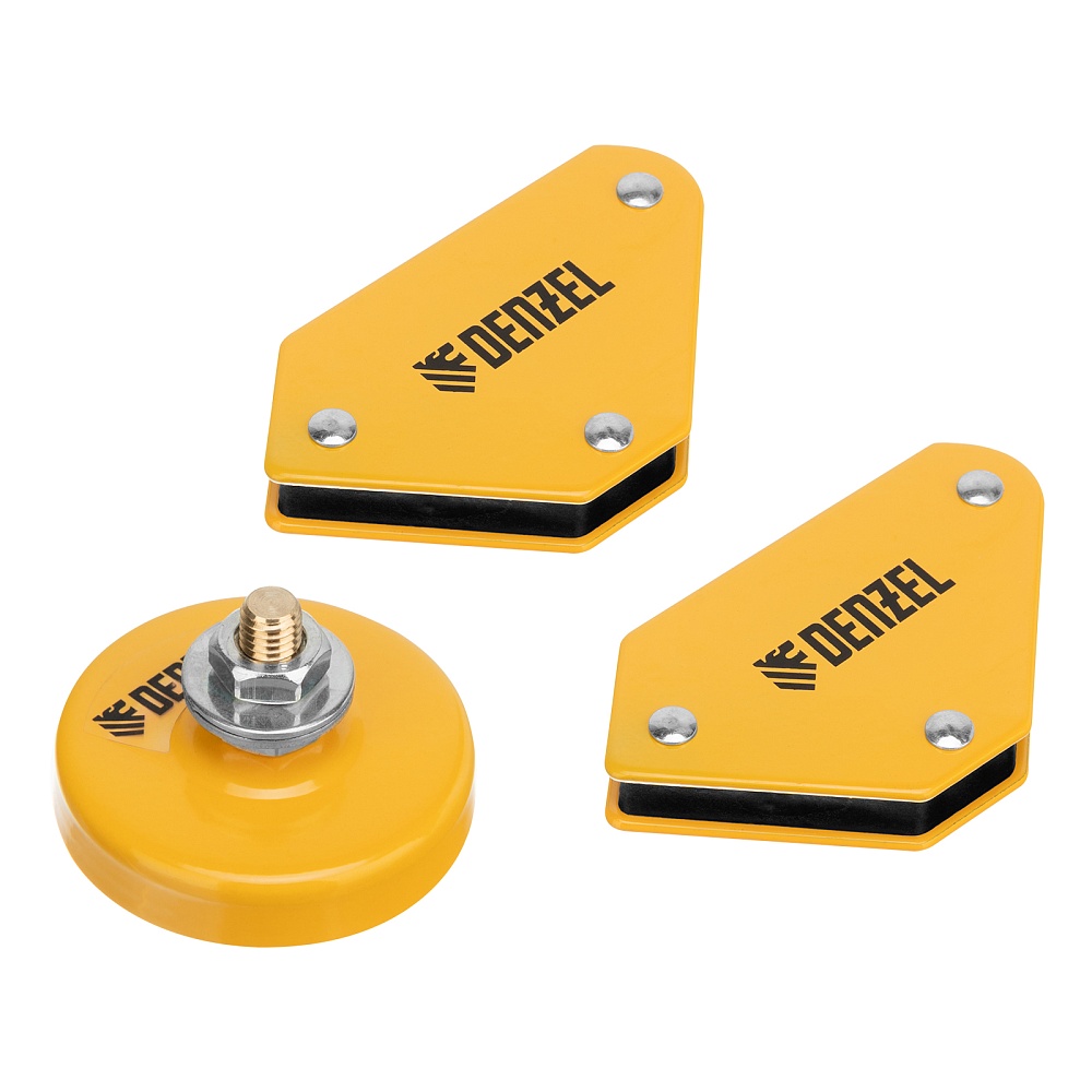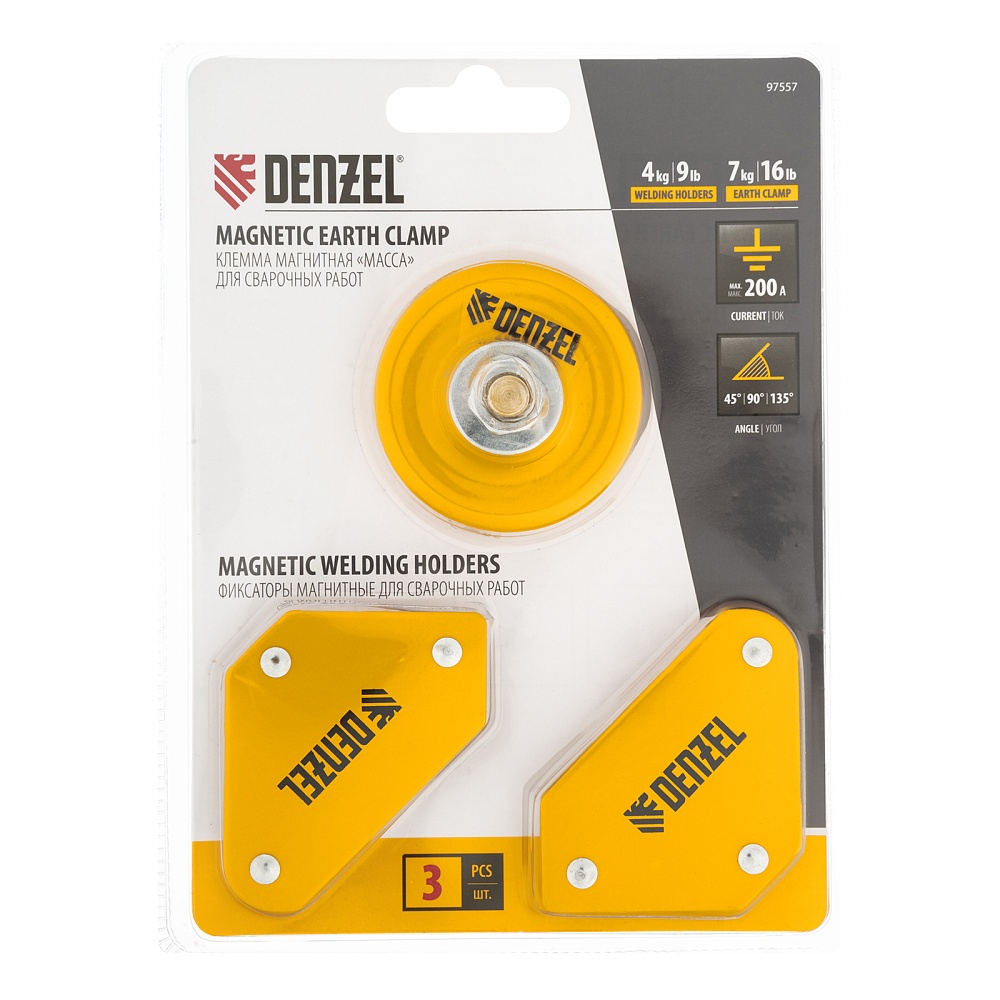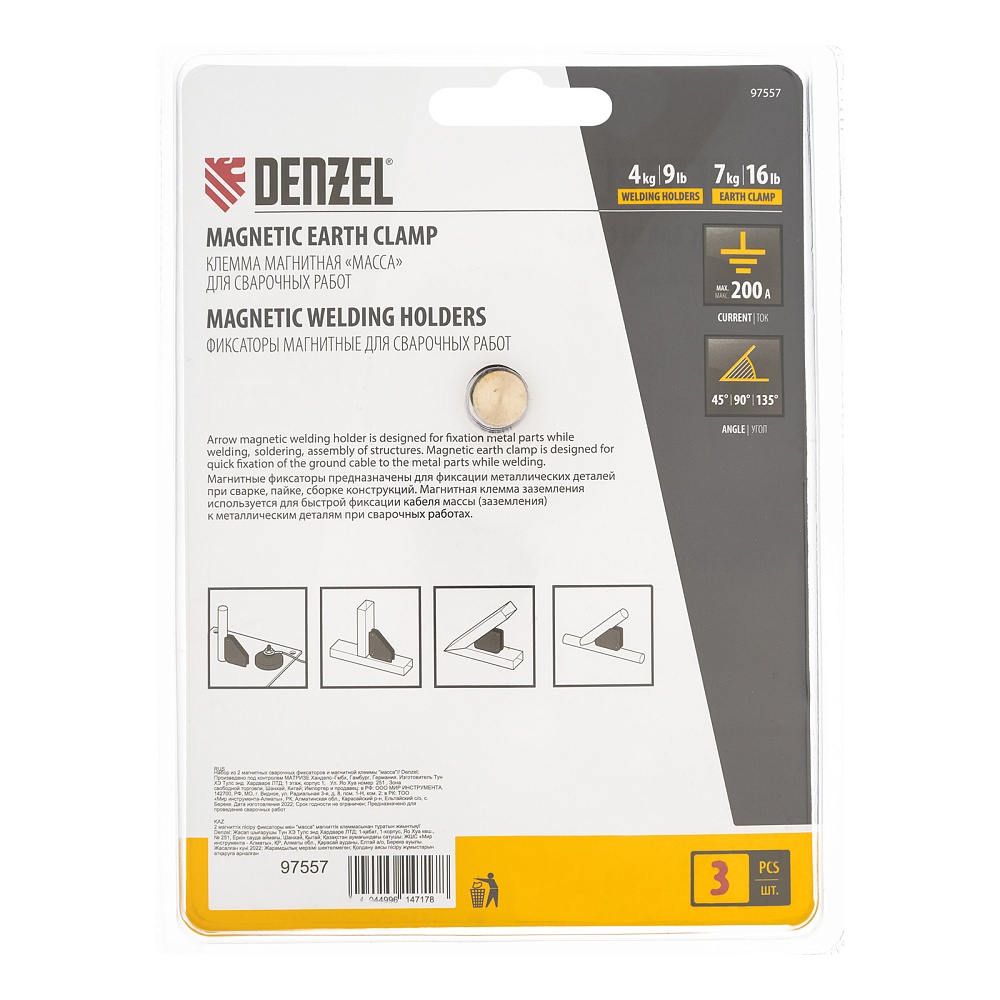 <p>Набор из 2 магнитных фиксаторов и магнитной клеммы «масса» Denzel 97557 предназначен для проведения сварочных работ, пайки и монтажа металлоконструкций. Клемма с максимальным током 200 А обеспечивает электрическое соединение кабеля заземления и обрабатываемой детали, без которого невозможна ручная дуговая сварка. А магнитные уголки фиксируют свариваемые детали весом до 4 кг в нужном положении, благодаря чему мастер может работать в одиночку.</p><h2>Преимущества</h2><ul><li>Прочность и долговечность — элементы набора устойчивы к ударам и внешним повреждениям благодаря износостойкому корпусу.</li><li>Универсальное решение для разных задач — с помощью магнитных уголков можно выставлять элементы под углом 45, 90 или 135 градусов или использовать их одновременно для выстраивания более сложных конструкций.</li><li>Простое применение — пользоваться инструментами интуитивно понятно и удобно, они не требуют сложного обслуживания.</li></ul>
