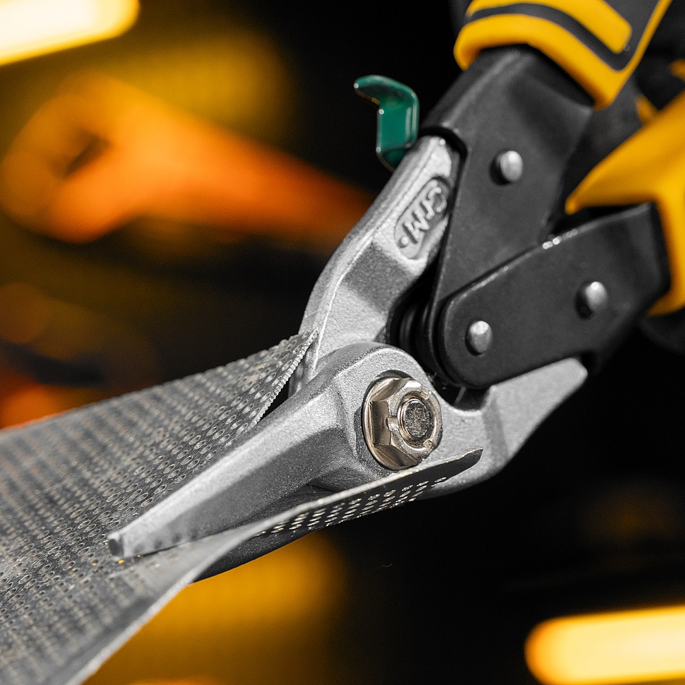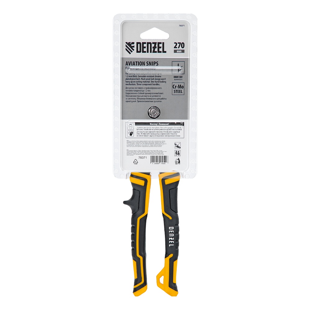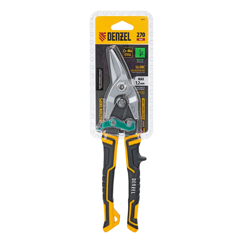 <p>Ножницы по металлу Denzel 78371 общей длиной 270 мм, из стали-CrMo, с трехкомпонентными рукоятками, предназначены для прямого и правого реза листовых металлических заготовок и металлопрофиля толщиной до 1,2 мм. Инструмент с усиленной конструкцией осевого шарнира рассчитан на профессиональное использование. Ножницы используются для проведения строительных, кровельных и слесарных работ.</p><h2>Преимущества</h2><ul><li>Высокое качество исполнения — ножницы изготовлены из прочной хромомолибденовой стали методом горячей штамповки, остро заточенные кованые лезвия с насечками не соскальзывают с заготовок.</li><li>Эффективность — режущие кромки закалены до твердости 60-62 HRC и легко справляются даже с прочной «нержавейкой».</li><li>Безопасность — блокировочный замок предотвращает случайное раскрытие лезвий во время транспортировки и хранения.</li><li>Комфортная работа — плоский соединительный винт не цепляется за заготовки, удлиненные трехкомпонентные рукоятки не выскальзывают из руки.</li><li>Удобное хранение — на рукоятке имеется проушина для подвешивания на крючок или гвоздь.</li></ul>