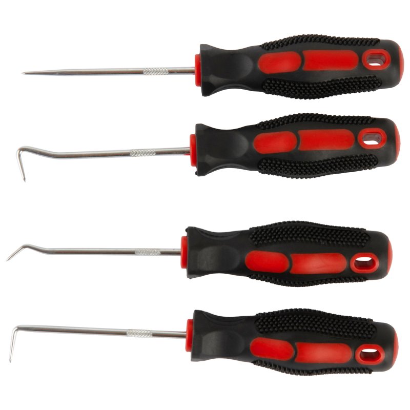 Набор мини крючков широко используется в сфере авторемонта, а также в слесарных мастерских. С их помощью осуществляют монтаж и снятие уплотнительных колец, разметку на поверхностях из различного материала и многое другое. Обрезиненная рукоять обеспечивает удобство эксплуатации, обладает противоскользящими свойствами. В комплекте 4 крючка разной формы: полный крючек, угловой крючок, крючок 90°, шило.