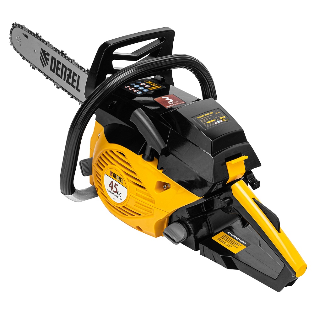 <p>Пила цепная бензиновая Denzel DGS-4516 95230 с двигателем объемом 45 см3 и мощностью 3,0 л.с. поставляется с шиной длиной 40 см и цепью с 57 звеньями (шаг 3/8″, паз 1,3 мм). Это бытовой инструмент для заготовки дров, обрезки ветвей и сучьев в саду, распила древесины твердых и мягких пород. Пила выдерживает интенсивные нагрузки, используется во время строительных и ремонтных работ, будет полезна на дачном участке.</p><h2>Преимущества</h2><ul><li>Эффективность — двигатель Garden Line от Denzel обеспечивает высокую производительность и экономичный расход топлива.</li><li>Высококачественное исполнение — хромированный цилиндр, закаленный коленвал, облегченный поршень и свеча зажигания Bosch значительно повышают ресурс пилы.</li><li>Безопасность пользователя — специальный щиток и автоматический тормоз цепи уменьшают риск получения травм при отскоке пилы, также предусмотрена защита от случайного пуска.</li><li>Праймер для подкачки топлива — пила легко запускается даже после длительного простоя.</li><li>Долговечность — автоматическая система смазки цепи не допускает перерасхода масла и снижает износ цепи и шины.</li><li>Стальной зубчатый упор — пилу удобно фиксировать в процессе работы для повышения качества реза и уменьшения отдачи.</li><li>Комфортная работа — антивибрационная система уменьшает нагрузку на руки.</li><li>Вместительный топливный бак — объем 550 мл позволяет работать долгое время без заправки.</li><li>Удобное обслуживание — конструкцией предусмотрен быстрый доступ к фильтру и свече зажигания.</li><li>Гарантия 3 года — высокое качество инструмента подтверждено производителем.</li></ul>
