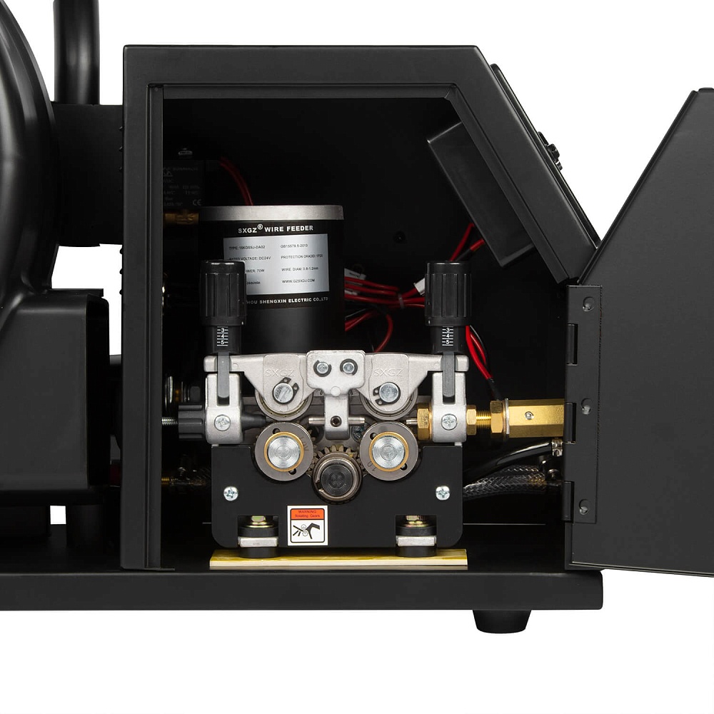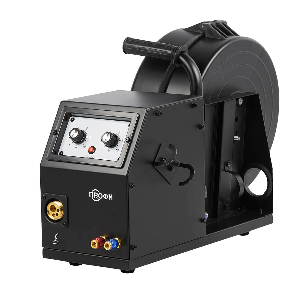 - 4-х роликовый металлический механизм подачи проволоки. Возможно установить катушку с проволокой весом до 15 кг. В подающем механизме установлены ролики 30х10х12 для стальной проволоки диаметром 0,8-1,0 мм.