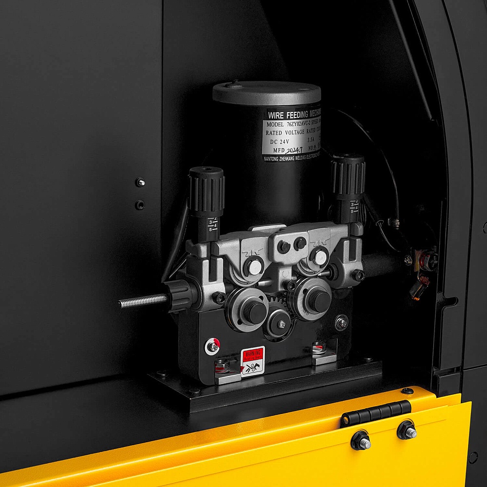 - Аппарат с встроенным подающим механизмом, где установлен 4-х роликовый металлический механизм подачи проволоки. Используется сварочная проволока диаметром от 0,8 до 1,2 мм. Можно установить катушку с проволокой весом до 18 кг (D300) и регулировать скорость подачи проволоки от 3 до 16 м/мин.