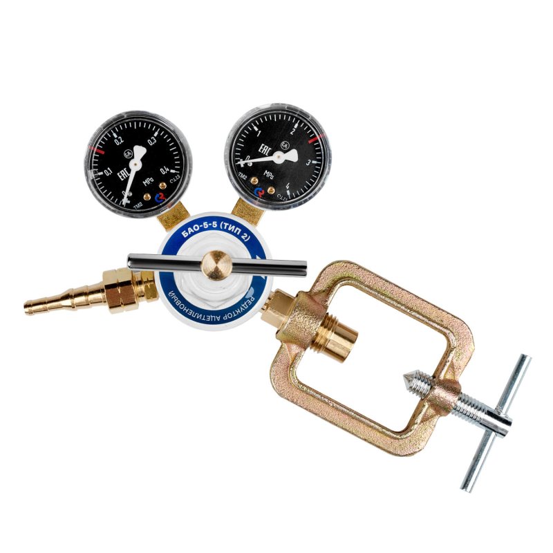 Ацетиленовый редуктор БАО-5-5 (тип 2) предназначен для понижения давления газа, поступающего из баллона, и автоматического поддержания постоянным заданного рабочего давления при газопламенной обработке. Производит тонкую настройку рабочего давления.