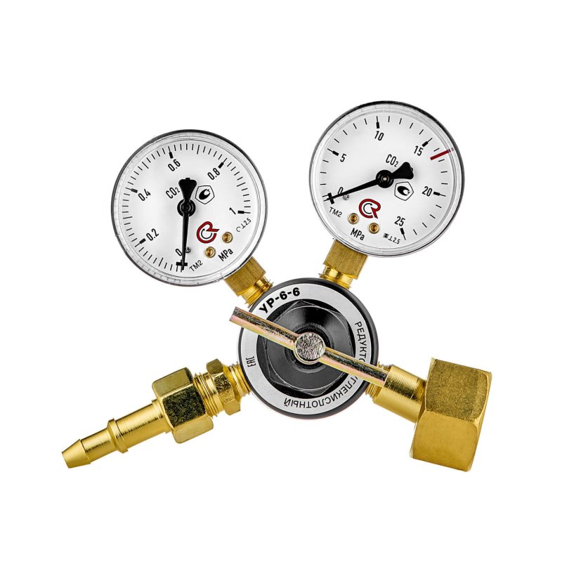 Редуктор углекислотный УР-6-6 предназначен для понижения давления газа, поступающего из баллона, и автоматического поддержания постоянным заданного рабочего давления при газопламенной обработке. Производит тонкую настройку рабочего давления. Срабатывание предохранительного клапана происходит при давлении в 0,6 МПа.