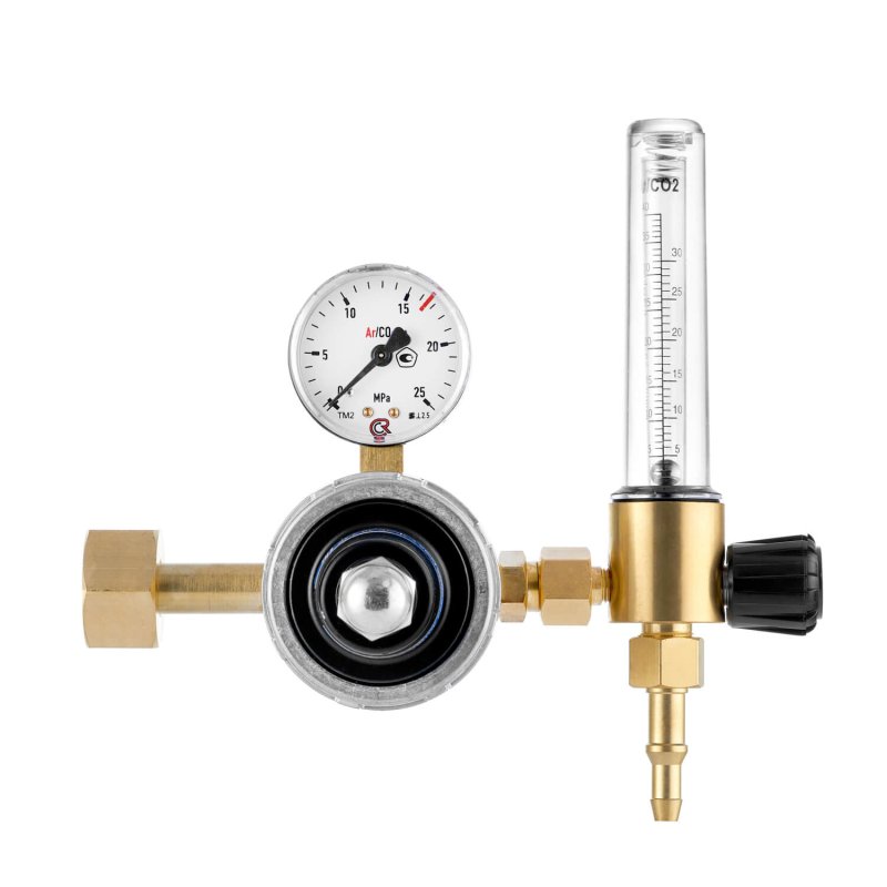Латунный регулятор расхода газа с одним ротаметром. Регулятор предназначен для углекислоты и аргона. Поставляется в комплекте с гайкой M16х1,5 и универсальным ниппелем под рукава 6 и 9 мм.