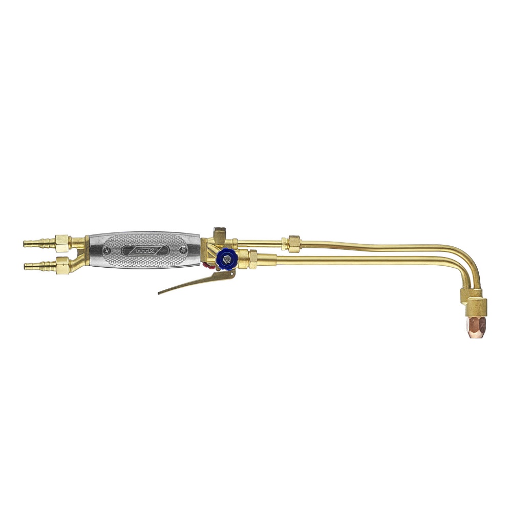 Резак с клапаном кислорода режущего (КР). Запорные вентили (кислород подогревающий и горючий газ) изготовлены из нержавеющей стали. На штоке вентилей установлен уплотнитель из фторопласта. Данная конструкция позволяет легко подтянуть сальниковую гайку, чтобы добиться необходимого плавного открытия вентилей.