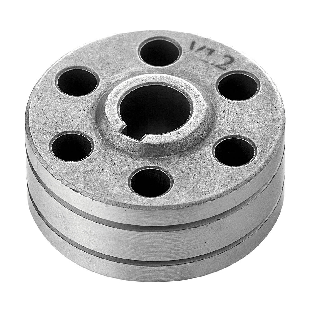 Это сменный элемент выносного подающего механизма, который подбирается в соответствии с видом сварочной проволоки и ее диаметром. Ролики предназначены для работы со стальной проволокой диаметром от 1,0 до 1,2 мм. Габаритные размеры роликов 37х10х15 мм. Подающие ролики имеют две направляющие канавки V-образной формы. При изменении сечения проволоки необходимо перевернуть ролик нужной стороной и использовать его далее. Канавки ролика обеспечивают плотный контакт с проволокой, в результате чего она не проскальзывает и не заламывается.