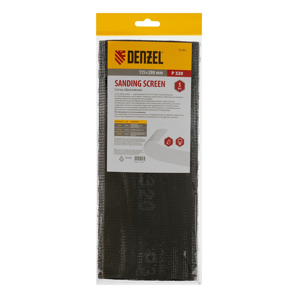 <p>Абразивная сетка Denzel 75185 размером 115 х 280 мм, с зернистостью P 320, 5 шт. в упаковке, применяется для финишной обработки и придания гладкости зашпаклеванным поверхностям, а также твердой древесине и металлу. Бережно снимает тонкий слой материала и лакокрасочного покрытия, удаляет ржавчину и заусенцы, сглаживает неровности. Обладает высоким ресурсом, т.к. заостренные зерна карбида кремния стачиваются медленно. Сетку устанавливают на ручное шлифовальное приспособление — брусок или сеткодержатель соответствующего типоразмера.</p><h2>Преимущества</h2><ul><li>Прочность — основа сетки из стекловолокна устойчива к разрыву.</li><li>Эффективная работа — благодаря ячеистой структуре полотно практически не забивается продуктами шлифования.</li><li>Двустороннее нанесение абразивного материала — в случае изнашивания достаточно перевернуть сетку и продолжить работу.</li><li>Простой уход — рабочее полотно можно очистить легким постукиванием.</li><li>Удобная комплектация — упаковки из 5 штук хватит для выполнения большого объема работ.</li></ul>