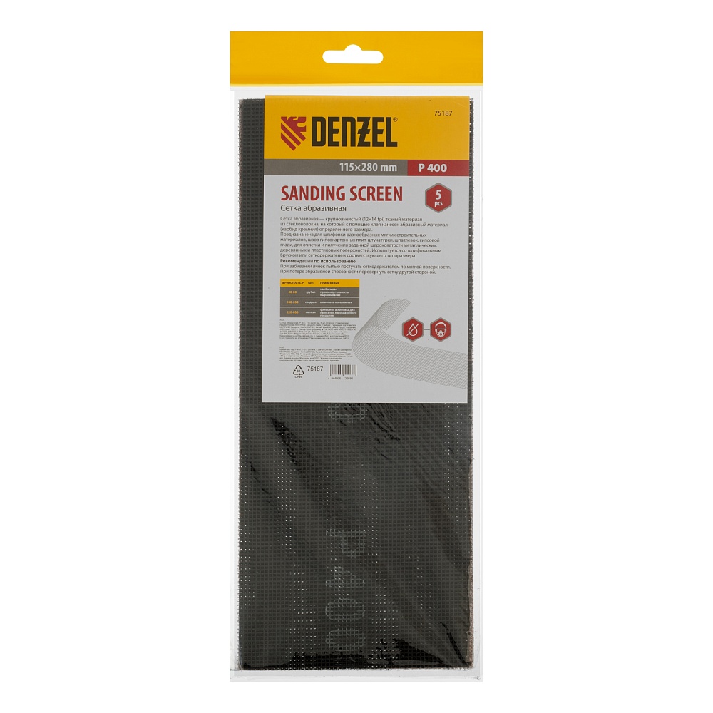 <p>Абразивная сетка Denzel 75187 размером 115 х 280 мм, с зернистостью P 400, 5 шт. в упаковке, применяется для финишной обработки и придания гладкости зашпаклеванным поверхностям, а также твердой древесине и металлу. Бережно снимает тонкий слой материала и лакокрасочного покрытия, удаляет ржавчину и заусенцы, сглаживает неровности. Обладает высоким ресурсом, т.к. заостренные зерна карбида кремния стачиваются медленно. Сетку устанавливают на ручное шлифовальное приспособление — брусок или сеткодержатель соответствующего типоразмера.</p><h2>Преимущества</h2><ul><li>Прочность — основа сетки из стекловолокна устойчива к разрыву.</li><li>Эффективная работа — благодаря ячеистой структуре полотно практически не забивается продуктами шлифования.</li><li>Двустороннее нанесение абразивного материала — в случае изнашивания достаточно перевернуть сетку и продолжить работу.</li><li>Простой уход — рабочее полотно можно очистить легким постукиванием.</li><li>Удобная комплектация — упаковки из 5 штук хватит для выполнения большого объема работ.</li></ul>