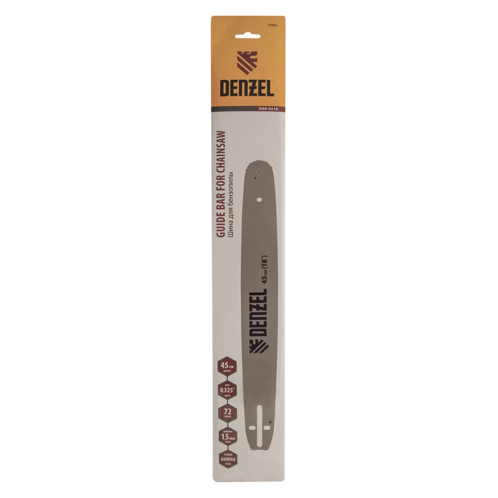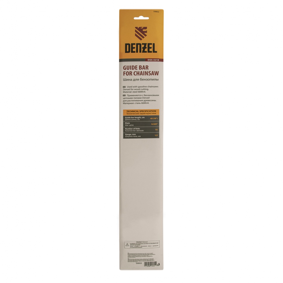 <p>Шина Denzel 59802 длиной 45 см (18″), с шириной паза 1,5 мм, предназначена для установки цепи с 72 звеньями и шагом 0,325″, совместима с бензопилой Denzel DGS-5218. Оптимальна для работы с древесиной мягких и средних пород. Позволяет использовать бензопилу для распиловки бревен, срезания веток, валки деревьев, формирования кровли дома, строительства веранды, бани и т. д. Инструмент с установленной шиной будет полезен на загородном участке, пригодится во время охоты или рыбалки.</p><h2>Преимущества</h2><ul><li>Надежность — пильное полотно из немецкой конструкционной стали 66Mn4 с порошковым покрытием устойчиво к деформации и образованию коррозии.</li><li>Высокий ресурс — звездочка, передающая крутящий момент к цепи, отличается износостойкостью.</li><li>Длительная эффективная работа — технологические каналы позволяют дозированно подавать смазочное масло на паз шины и способствуют его равномерному распределению по всей рабочей кромке, что продлевает срок службы пильной гарнитуры.</li></ul>