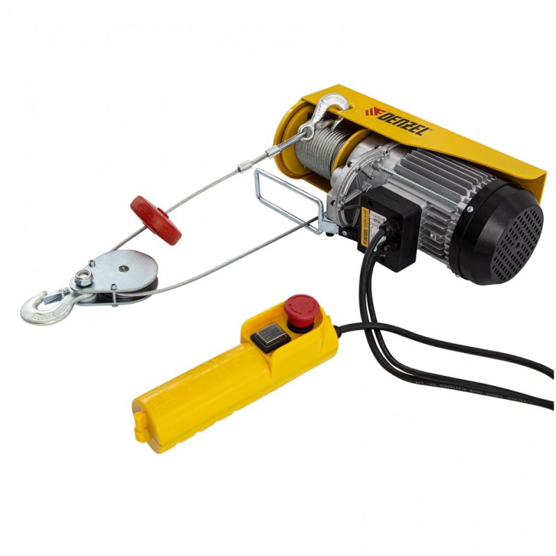 <p>Электрический тельфер Denzel TF-800 52014 мощностью 1300 Вт способен поднимать автомобильные двигатели, строительные материалы и другие грузы массой до 0,4 т напрямую и до 0,8 т с помощью блока полиспаста. Высота подъема составляет 6 м при использовании полиспаста и 12 м без него, скорость — 4 и 8 м/мин соответственно. Устройство пригодится в гараже, автомастерской или на строительной площадке. Полиспаст входит в комплект поставки.</p><h2>Преимущества</h2><ul><li>Долговечный двигатель — медная обмотка устойчива к перегреву и высоким нагрузкам, а специальные ребра и решетка обеспечивают эффективное охлаждение.</li><li>Безопасность груза — встроенная система защиты не допускает самопроизвольного разматывания троса.</li><li>Функция автоматической остановки — тельфер отключается при превышении допустимого веса груза или высоты подъема.</li><li>Возможность экстренного торможения — кнопка аварийной остановки позволяет моментально прекратить работу при необходимости.</li><li>Надежная фиксация груза — на крюке имеется предохранительная скоба.</li><li>Продуманная конструкция — благодаря специальному навесу крюк всегда находится в вертикальном положении.</li><li>Прочный трос — он изготовлен из стали, а его толщина составляет 5,1 мм.</li><li>Удобная эксплуатация — управление осуществляется с выносного пульта.</li><li>Быстрый монтаж — в комплект входит набор крепежей для установки тельфера.</li><li>Гарантия 3 года — надежность оборудования подтверждена производителем.</li></ul>