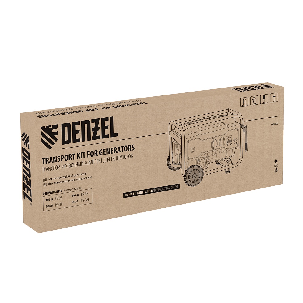 <p>Транспортировочный комплект Denzel 94669, включающий 2 колеса и 2 ручки, совместим с генераторными установками Denzel PS-25, PS-28, PS-33, PS-33E (артикулы 946814, 946824, 946834, 94537). Предназначен для перемещения генератора по рабочей площадке.</p><h2>Преимущества</h2><ul><li>Эффективное решение поставленных задач — транспортировка генератора происходит быстро и без усилий.</li><li>Быстрая установка — рукоятки легко собираются, все необходимое для монтажа входит в комплект поставки.</li><li>Надежность — элементы комплекта рассчитаны на длительную эксплуатацию.</li></ul>