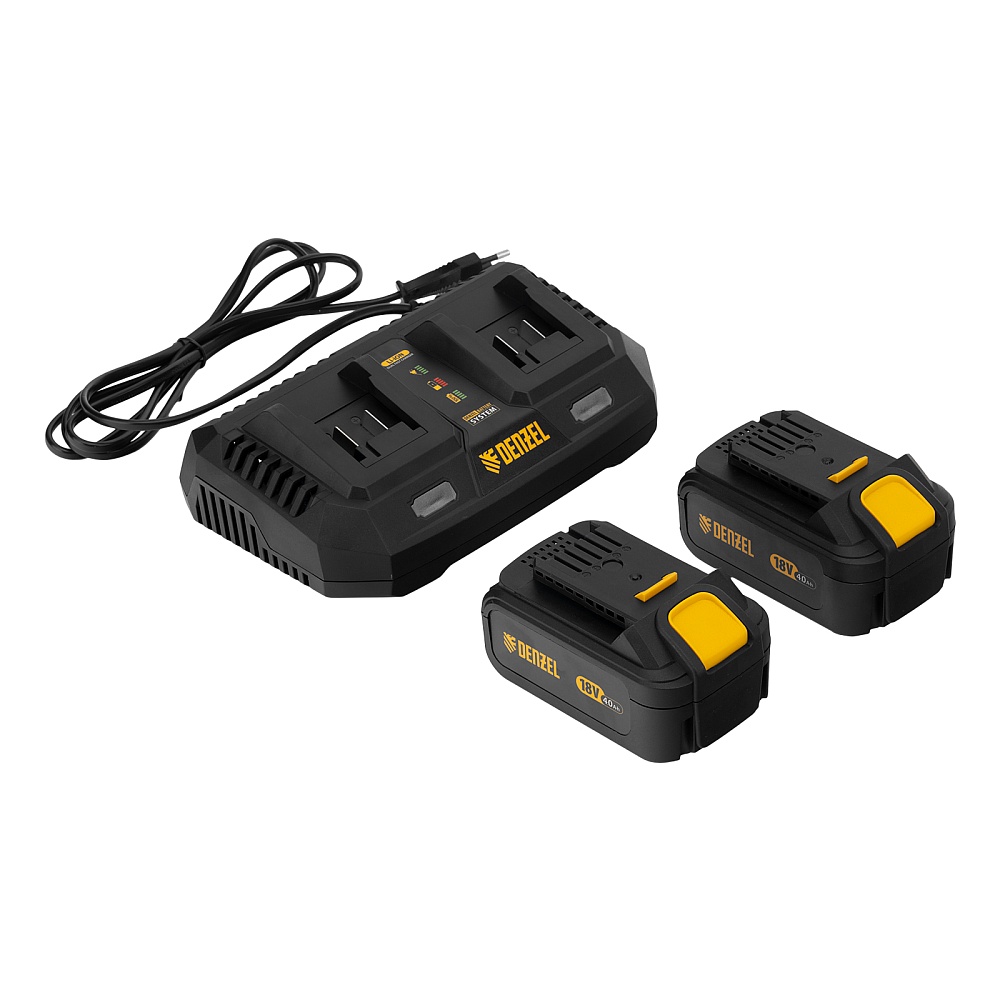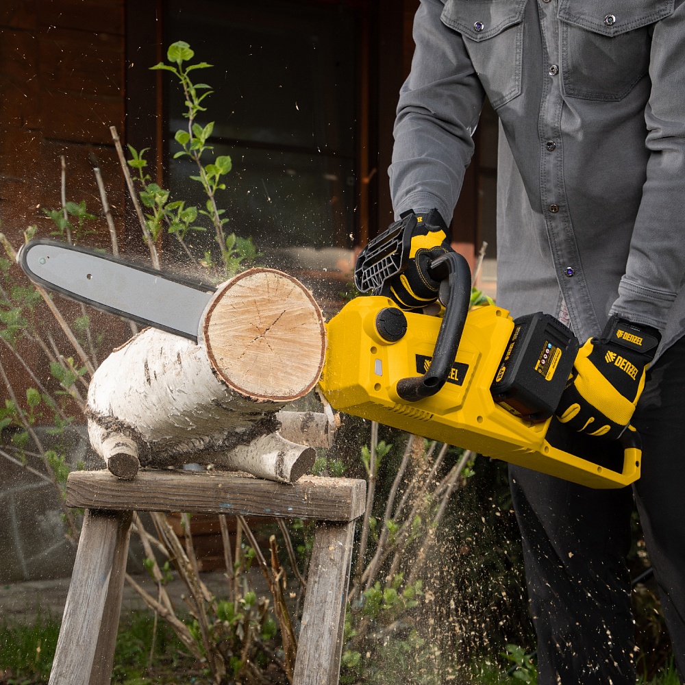 <p>Аккумуляторная цепная пила Denzel RCS400-36 58610 с Li-ion аккумуляторами напряжением 36 В и шиной длиной 400 мм предназначена для валки деревьев, распила древесины, заготовки дров и прочих хозяйственных работ. Ультрасовременный бесщеточный двигатель обеспечивает вращение цепи со скоростью 19 м/c. Он превосходит щеточные аналоги по мощности, надежности и неприхотливости в обслуживании.,Пила функционирует от двух аккумуляторов увеличенной емкости 4 А*ч Li-ion 18 В с интеллектуальной системой распознавания нагрузки, которые позволяют эффективно работать без подзарядки долгое время. Модель поставляется с прочной и легкой шиной OREGON длиной 40 см и цепью с шагом 3/8 дюйма. Инструмент полностью укомплектован и готов к работе сразу после приобретения.</p><h2>Преимущества</h2><ul><li>Экологичность — пила не производит вредных выхлопов, может использоваться в закрытых помещениях.</li><li>Универсальность — аккумуляторы 4Ач Li-ion совместимы с любым инструментом 18V Denzel battery system серии IB.</li><li>Продольное расположение двигателя — инструмент хорошо сбалансирован, при работе его не ведет в стороны, что позволяет выполнять более ровные и чистые надпилы, а также работать в ограниченном пространстве.</li><li>Безопасность — передний щиток защищает мастера от контакта с пильной фурнитурой, а инерционный тормоз цепи мгновенно срабатывает в экстренных ситуациях.</li><li>Защита от перегрева и перегрузок — превышение допустимой силы тока или температуры распознается автоматически и пила отключается во избежание поломки двигателя.</li><li>Быстрая подготовка к работе — бесключевое натяжение цепи значительно экономит время мастера.</li><li>Автоматическое смазывание цепи — подача масла осуществляется в зависимости от нагрузки, что предотвращает перегрев двигателя и преждевременный износ фурнитуры.</li><li>Комфортная работа — в сравнении с бензиновыми пилами, аккумуляторная модель не создает сильных вибраций и имеет достаточно низкий уровень шума.</li><li>Защита от внезапного запуска — блокировка клавиши выключателя позволяет приступить к работе только при полной готовности.</li><li>Надежный хват — прорезиненная рукоятка обеспечивает удобный захват и не проскальзывает в руках.</li><li>Небольшой вес — в сборе пила весит всего 3,6 кг, что позволяет комфортно работать продолжительное время.</li><li>Парное зарядное устройство — оба аккумулятора можно заряжать одновременно, поэтому на подготовку инструмента к работе уходит меньше времени.</li><li>Простое отслеживание уровня заряда — яркий LED-индикатор подскажет, когда необходимо зарядить аккумуляторы.</li><li>Гарантия 3 года — высокое качество пилы Denzel подтверждено производителем.</li></ul>