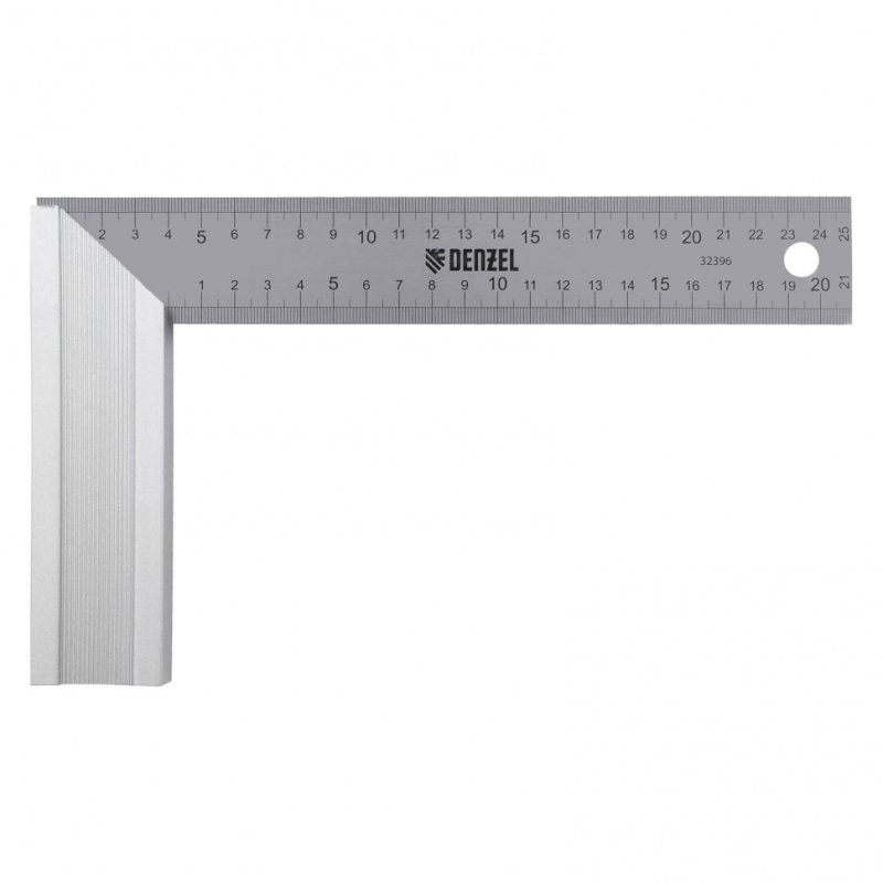 <p>Стальной угольник Denzel 32396 длиной 250 мм, с градуировкой, алюминиевым основанием и полотном из нержавеющей стали, используется для построения и контроля углов. Будет полезен для выполнения столярных и строительных работ.</p><h2>Преимущества</h2><ul><li>Прочность и долговечность — основание изготовлено из анодированного алюминия, рабочее полотно — из нержавеющей стали.</li><li>Надежная конструкция — линейка соединена с основанием при помощи заклепок.</li><li>Удобный хват — благодаря ребристой поверхности основание не выскальзывает из ладони.</li><li>Комфортная эксплуатация — двухсторонняя измерительная шкала облегчает работу.</li><li>Удобное хранение — благодаря специальному отверстию инструмент можно подвешивать на крючок или гвоздь.</li></ul>