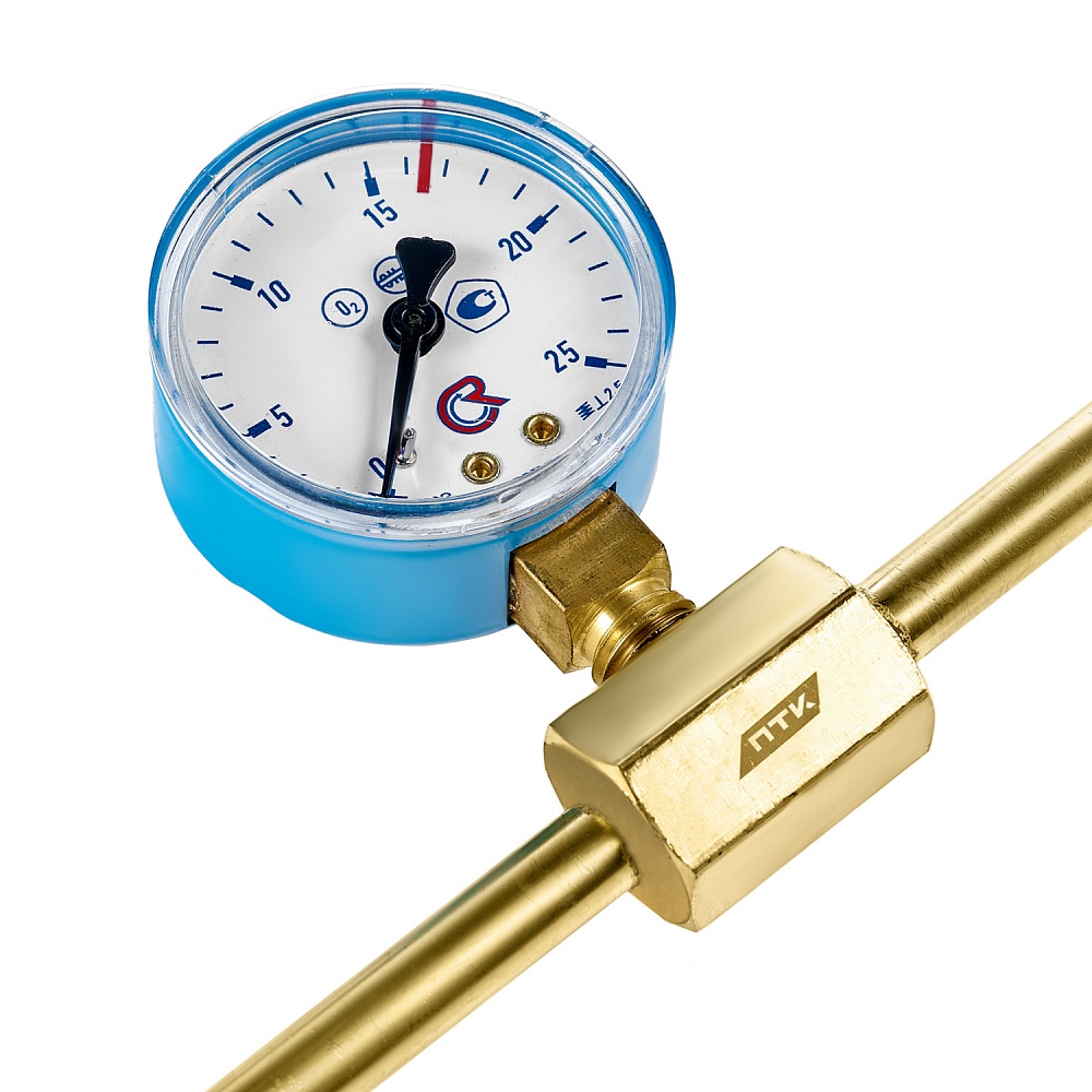 Контроль давления в баллонах осуществляется при помощи сварочного манометра. Манометр с радиальным присоединением, резьба присоединения – M12х1,5. Класс точности – 2,5. Максимальное давление газа на входе – 25 МПа. Не предназначено для пропановых и ацетиленовых баллонов.