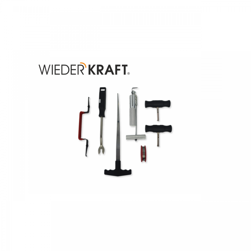 В комплекте:  Лопатка для демонтажа заклепок с обшивки. Нож для демонтажа вклеенных автомобильных стекол. Две ручки для струны. Струна для вырезания вклеенных автомобильных стекол. Нож для удаления резинки вокруг стекла. Плоский стилет для введения струны.