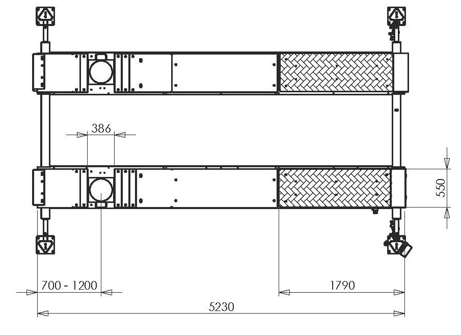 Velyen 4ED0600, подъемник четырехстоечный электрогидравлический, г/п 5000 кг., 2,2 кВт, высота подъема 190-1800 мм., размеры платформ 5230x580 мм, платформы - для сход-развала. Эл.магнитная разблокировка задних здвижных пластин. Электростопора.