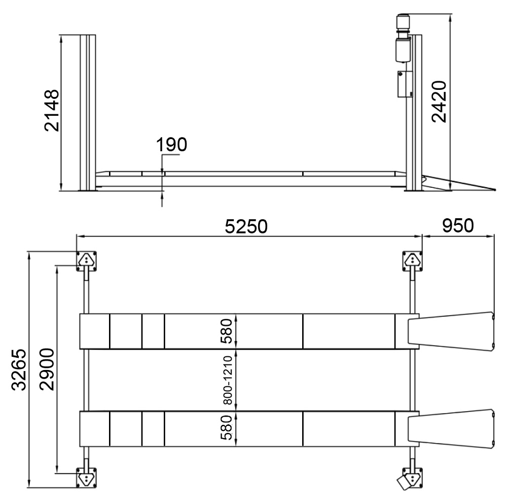Удлиненный электрогидравлический четырехстоечный подъёмник грузоподъемностью 6,5 т для обслуживания легкового и коммерческого транспорта Оснащение подъемника дает возможность производить регулировку развал/схождения, ремонт тормозной и рулевой систем, и другие работы