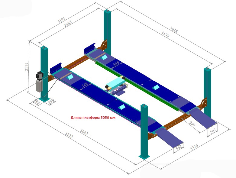Подъемник четырехстоечный, электрогидравлический, г/п 4000 кг., 2,2 кВт, высота подъема 1750 мм., размеры платформ 5050х550 мм, платформы - комплектация для поста сх-развала.