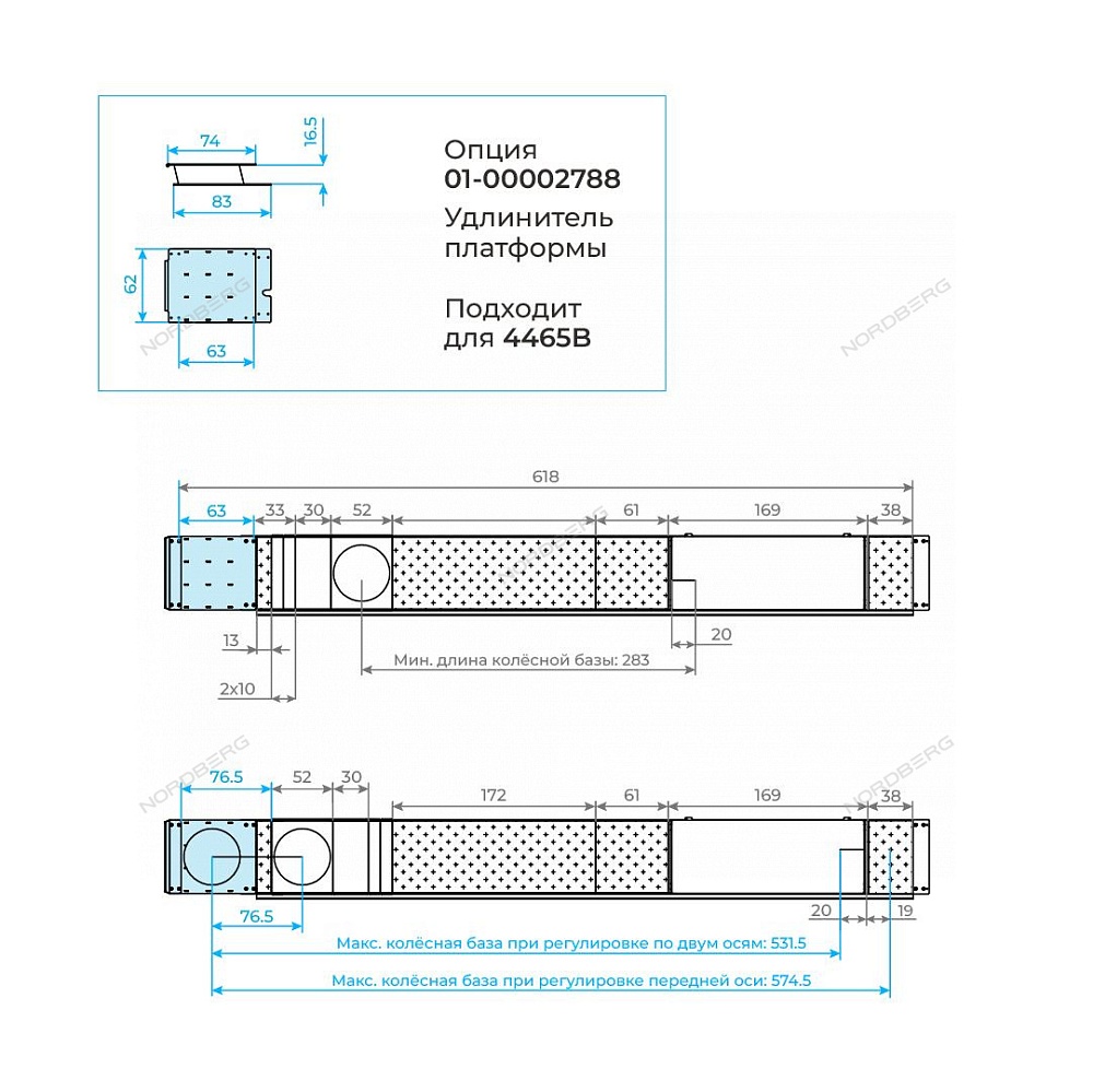 - При установке удлинительных платформ 01-00002788 длина рабочей поверхности увеличивается на 63 см и составляет 618 см. Это позволяет работать с транспортом с увеличенной базой и удлинённым кузовом;