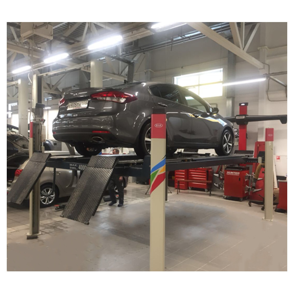 Четырехстоечный подъемник относится к платформенному типу грузоподъемных механизмов и предназначен для поднятия автомобилей под колеса. По типу исполнения и назначения данные подъемники подразделяются на два типа: с платформами под «сход-развал» и с гладкими платформами. Подъемники первого типа используются совместно со стендами регулировки углов установки колес автомобилей, а второго типа предназначены для проведения общеслесарных работ, не связанных с обслуживанием подвески автомобиля. Наибольшее распространение получили электрогидравлические подъемники, постепенно вытеснив электромеханические из-за простоты обслуживания и более тихой работы.