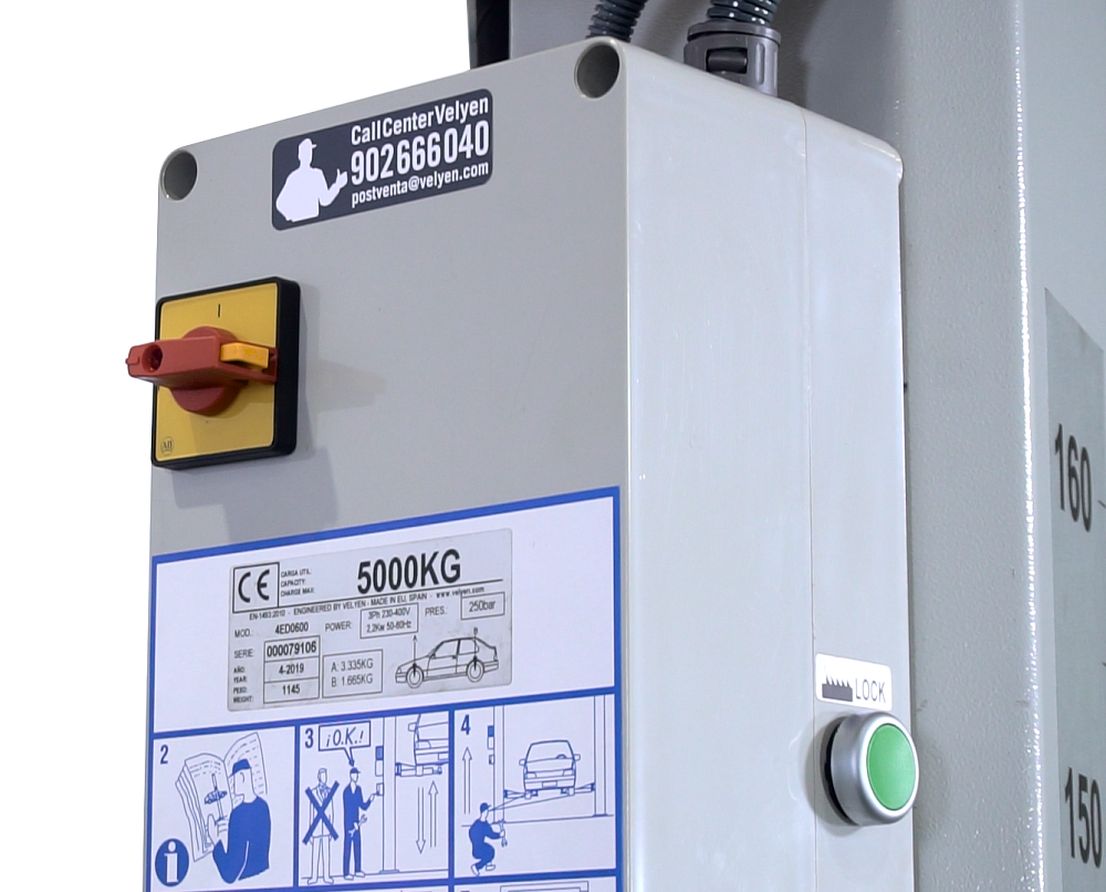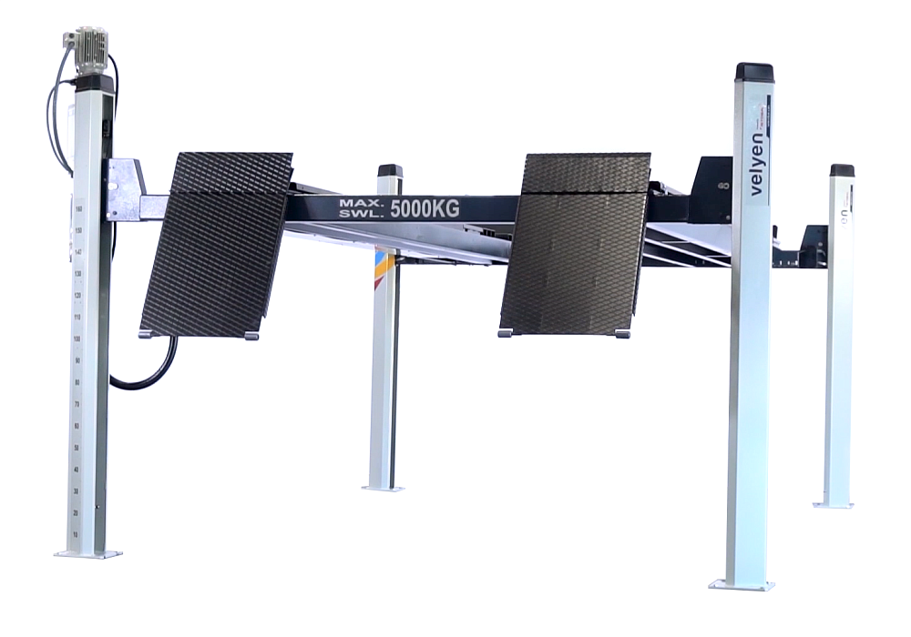Гидравлический четырехстоечный подъемник Velyen, модель 4ED0600 является универсальным и подходит как для проведения процедуры регулировки «сход-развала» (РУУК), так и для слесарных работ за счет демонтажа комплекта накладок на платформы, предназначенных под «сход-развал». Заявленная грузоподъемность составляет 5000 кг, в то время, когда в реальности подъемник может поднять и больший вес  до 5500 кг. Учитывая длину платформ составляющую 5230 мм, данный подъемник может обслуживать не только легковые автомобили и внедорожники, но и легкий коммерческий транспорт с подходящей колесной базой. Таким образом, подъемник еще более универсальный, по сравнению с подъемниками других производителей. Инновационный дизайн колонн без продольных сварных швов придает еще большую прочность конструкции. Ширина между колоннами составляет 2900 мм и обеспечивает отличную видимость для камер любого 3D стенда «сход-развал». Электромагнитная блокировка/разблокировка задних сдвижных пластин избавляет механика от необходимости делать это вручную.