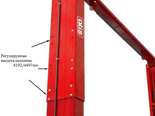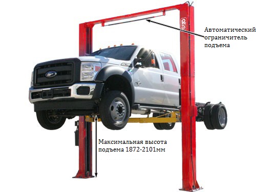 Двухстоечный электрогидравлический подъемник с нижней синхронизацией, грузоподъемность 4 т, механическое управление стопорами на одной колонне.