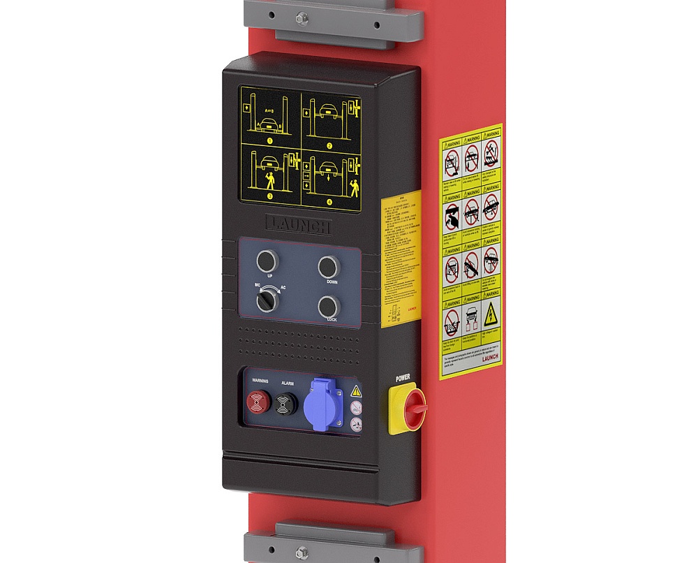 Двухстоечные подъемники Launch в модификациях SBA имеют удобный пульт управления, оборудованный розеткой 220В (класс защиты IP54). Пульт имеет два режима работы (ручной и автоматический) и аварийную индикацию. Автоматизированная система управления стопорами позволяет работать с подъемником простым нажатием кнопок Вверх / Вниз, без необходимости ручной дезактивации стопоров: система самостоятельно активирует/деактивирует стопорные механизмы и отслеживает работу крайних положений подъемника по концевикам.