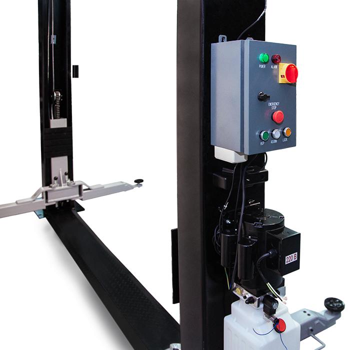 Электрогидравлический 2-х стоечный автомобильный подъёмник с верхней синхронизацией и разблокировкой рычагом на одной колонне, грузоподъемностью 4,5 тонны.