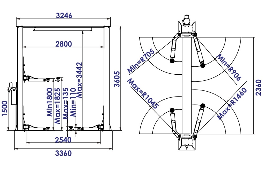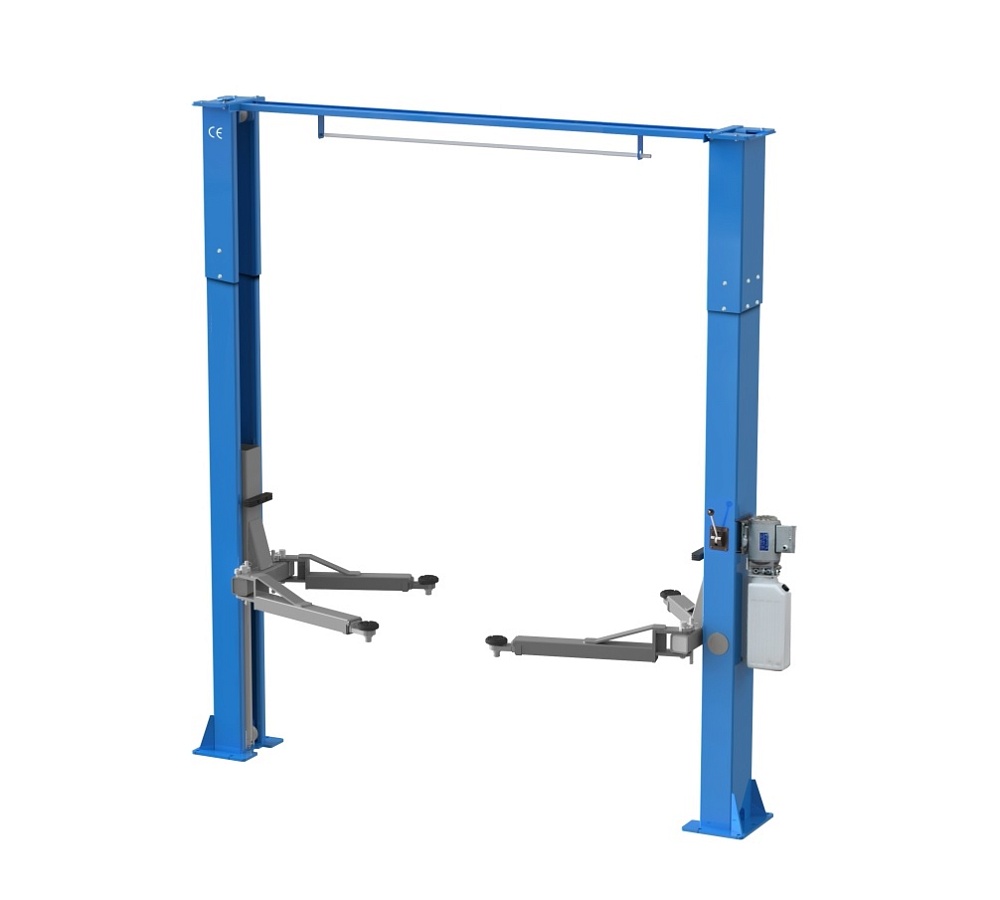 Электрогидравлический двухстоечный подъемник с нижней связью для легковых автомобилей, внедорожников и легкого коммерческого транспорта общей массой до 5т Классическая симметричная конструкция с удлиненными трехсоставными подхватами прекрасно подходит для работы на длиннобазных автомобилях Усиленная конструкция колонн Подходит для СТО с невысокими потолками