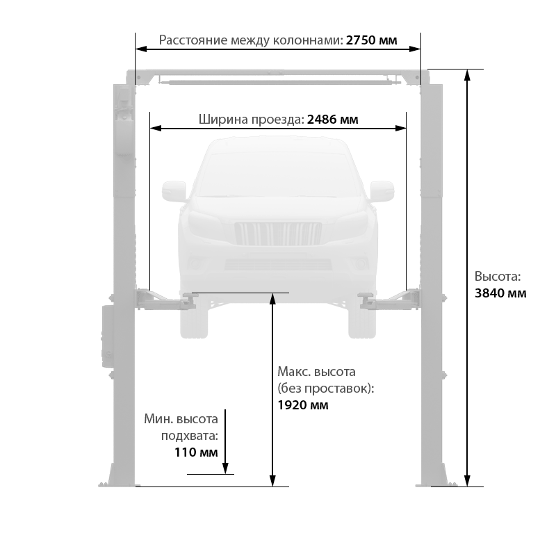 Усиленная конструкция элементов подъемника, шкивы увеличенного диаметра. Толщина металла профиля стойки – 6 мм. Элементы защиты в базовом комплекте поставки (гидравлические парашютные клапаны, защита движущихся механизмов, защитные рамки на лапах подхвата). Высота подхвата от 110 мм (двухсекционная винтовая регулировка для увеличения высоты подхвата). Максимальная высота подъема – до 1920 мм.