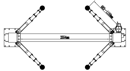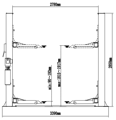 Высота подъёма 1825 мм, высота подъемника 2824 мм, общая ширина подъемника 3380 мм, расстояние между стойками 2820 мм. Электрогидравлический двухстоечный подъемник BRANN T4 Basic с нижней синхронизацией г/п 4 тонны.
