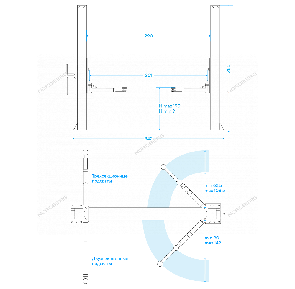 Подъемник двухстоечный 4 т, 380 В, серый NORDBERG N4120B-4G_3+2_380