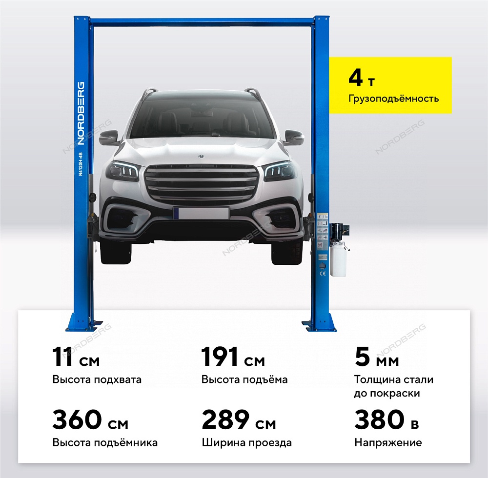 Подъемник двухстоечный 4 т, верхняя синхронизация, H=3,6 м, 380 В, синий NORDBERG N4120H-4B_3+2_380 купить в СПб цена ✅ - Все для СТО
