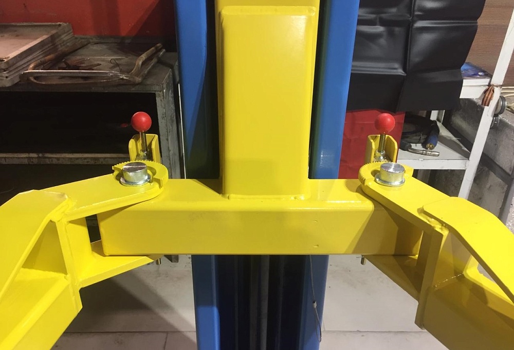 Электрогидравлический 2-х стоечный автомобильный подъёмник с верхней синхронизацией и разблокировкой рычагом на одной колонне, грузоподъемностью 4,5 тонны.