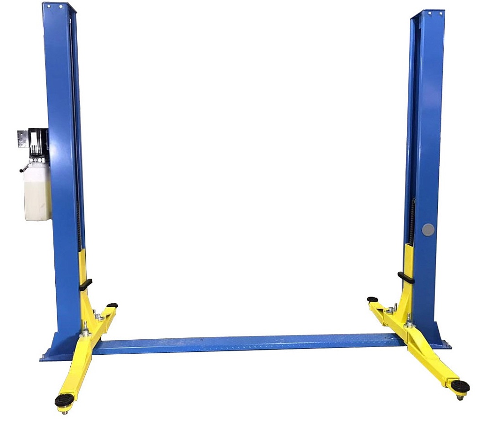 Двухстоечный электрогидравлический подъемник с нижней синхронизацией, грузоподъемность 4 т, механическое управление стопорами на одной колонне.