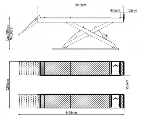 Ножничный  электрогидравлический   подъемник под сход развал, грузоподъемность 5.5т., длинна платформ 5018 мм.