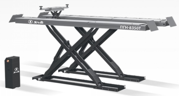 ПГН-8350Т Сивик  - подъемник ножничный электрогидравлический ГП 5000 кг. С пневмо-гидравлической траверсой ГП 2500 кг. Платформы для сход-развала со сдвижными пластинами и нишами под поворотные круги. Длина платформ 5000 мм. Высота подъема 2160 мм от основания. 380 В. Установка заглуюляемая или напольная.