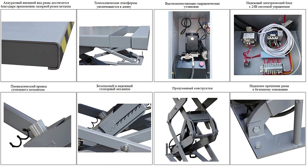 Подъемник оснащён пневматическим стопорным механизмом, требует подключения к пневмолинии. Раздвижные платформы увеличивают рабочую длину с 1550 до 1750 мм. Максимальная высота подъема — 2130 мм, высота от уровня пола — 1800 мм, заглубление — 330 мм. Расстояние между платформами — 780 мм. Стойка управления располагается отдельно, что упрощает размещение в помещении.