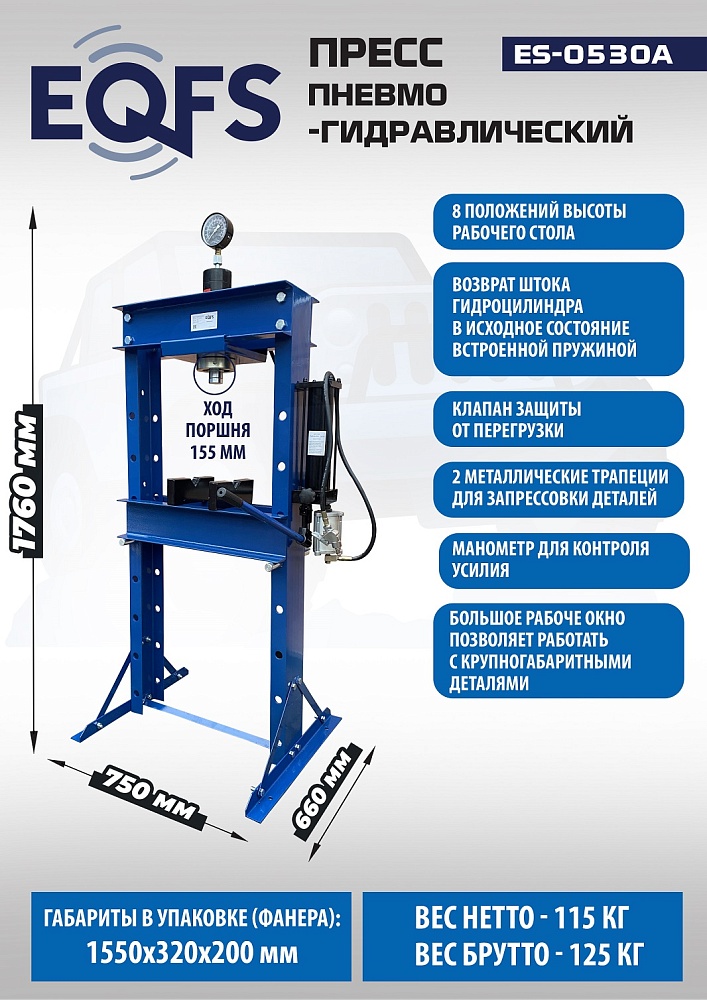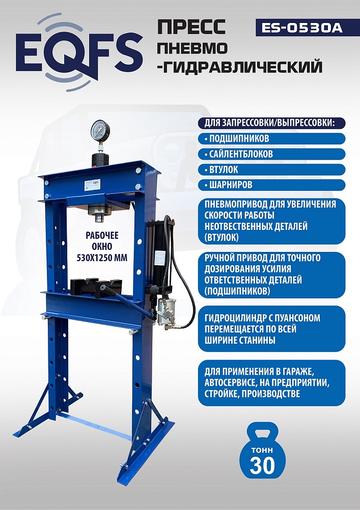 · Пресс укомплектован пневмогидравлическим и ручным насосом с максимальным усилием 30т.