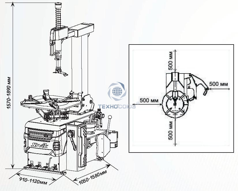 Шиномонтажный станок сертифицирован для продажи в России и ЕС. Станок изготовлен в России компанией Сивик. Установка – не менее 500мм от каждой стены помещения.