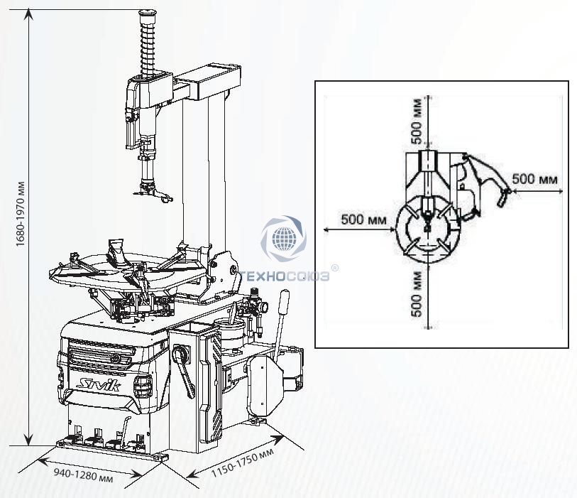 Шиномонтажный станок сертифицирован для продажи в России и ЕС. Станок изготовлен в России компанией Сивик. Установка – не менее 500мм от каждой стены помещения. Встроенная взрывная накачка значительно увеличит скорость работы шиномонтажника. Также позволит работать с низким профилем.
