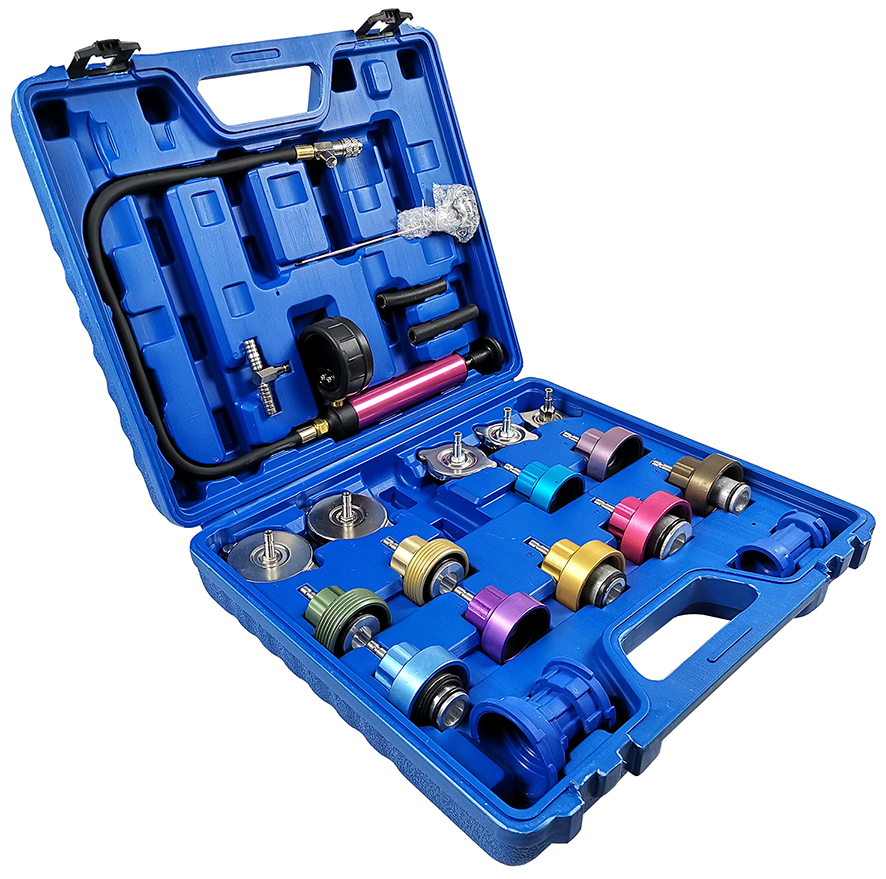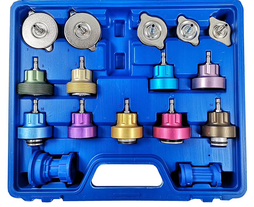 Инструмент позволяет легко проверить радиатор на предмет утечки и быстро заменить охлаждающую жидкость большинства автомобилей.
