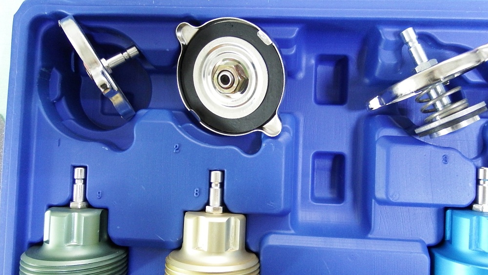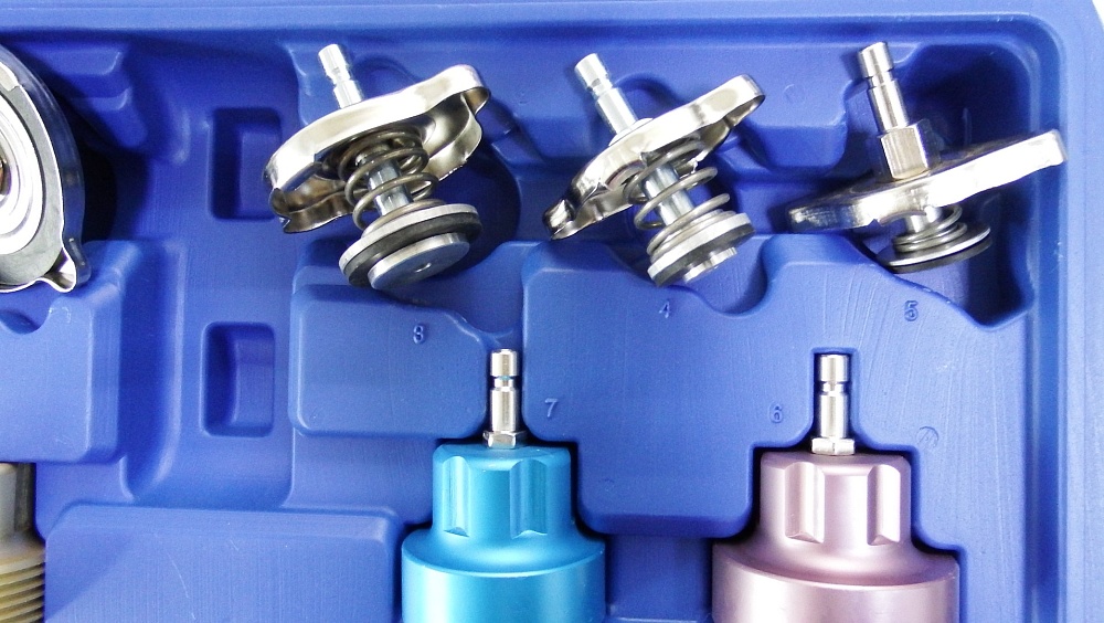 Тестер представляет собой набор деталей для диагностики систем охлаждения методом опрессовки.