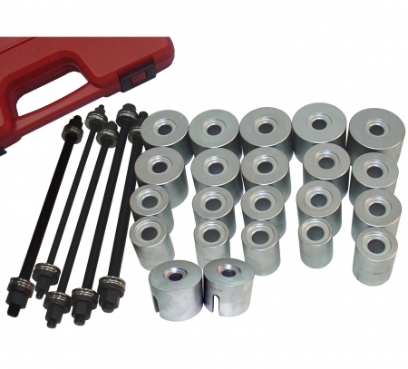 Комплект приспособлений которые позволяют производить работы по замене подшипников и сайлентблоков. Применение оправок из набора сащественно упрощает процесс перепрессовки. Состав комплекта: Оправки 44 x 34mmI. 60 x 50mmQ. 76 x 66mmB. 46 x 36mmJ. 62 x 52mmR. 78 x 68mmC. 48 x 38mmK. 64 x 54mmS. 80 x 70mmD. 50 x 40mmL. 66 x 56mmT. 82 x 72mmE. 52 x 42mmM. 68 x 58mmU. 85 x 75mmF. 54 x 44mmN. 70 x 60mmV. 90 x 80mmG. 56 x 46mmO. 72 x 62mm H. 58 x 48mmP. 74 x 64mm Резьбовой вал 1. M16 x 350mm 2. M14 x 350mm 3. M12 x 350mm 4. M10 x 350mm 5. M18 x 350mm Подходит для большинства автомобилей. Если элемент не поддается выпрессовке, следует: прекратить работу, разобрать инструмент, обработать поверхность выпрессовочного элемента проникающей смазкой, типа WD-40. После этого следует повторить процедуру демонтажа. Во время работы используйте большое количество смазки для предотвращения деформации направляющей шпильки. Во время работы запрещено использовать ударный инструмент. Набор относится к разряду профессионального инструмента. Его использование допускается только квалифицированным персоналом, соблюдая технику безопасности!
